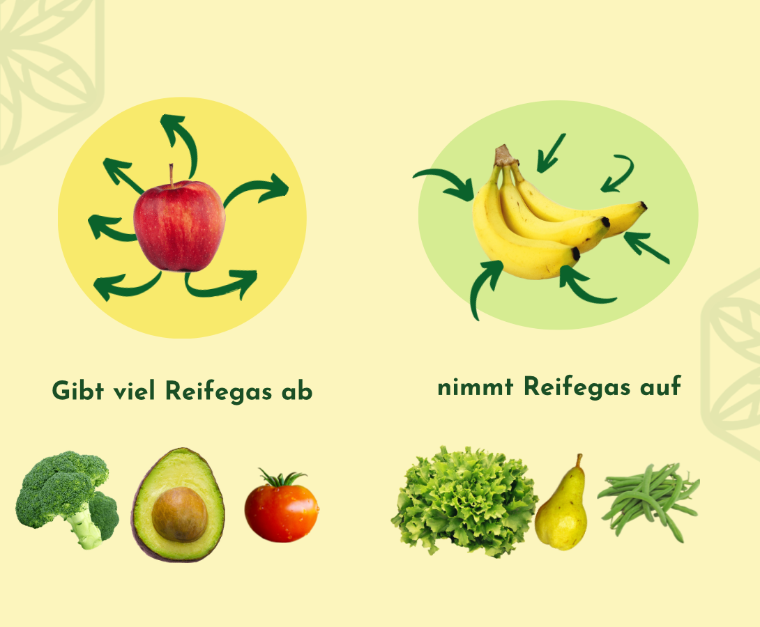 Viele Obst- und Gemüsesorten stoßen bei der Lagerung Reifegas aus. Dies beschleunigt den Abbau natürlicher Schutzfunktionen der umliegenden Früchte und damit den schnelleren Verderb. Die Industrie löst dieses Problem durch sogenannte CA-Lager (controlled atmosphere) die mit einer bestimmten Gaszusammensetzung in der Luft den Reifeprozess verlangsamen können. Für den Privathaushalt ist dieses Prinzip leider nicht anwendbar, weshalb wir uns auf die Suche nach einer anderen Lösung gemacht haben.