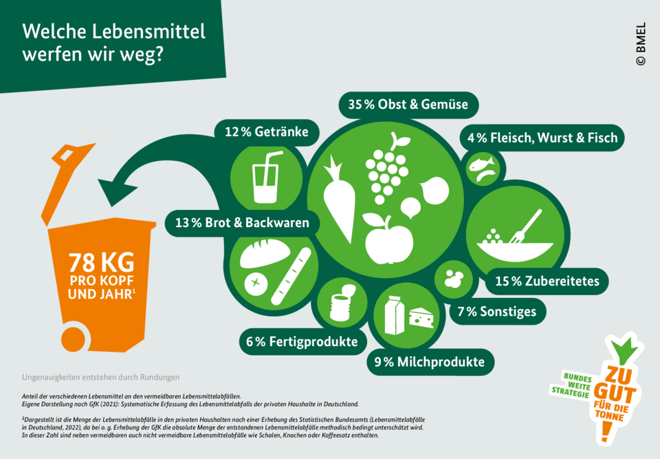 Jedes Jahr wird in Deutschland die beträchtliche Menge von 11 Millionen Tonnen Lebensmitteln weggeworfen, was einem Wert von über 60 Milliarden Euro entspricht. Studien zeigen, dass etwa 59% der vermeidbaren Lebensmittelabfälle in Deutschland allein aus privaten Haushalten stammen. Dies entspricht 6,5 Millionen Tonnen pro Jahr. Besonders frische Lebensmittel wie Obst und Gemüse sind davon betroffen. Diese Verschwendung hat nicht nur finanzielle Auswirkungen, sondern belastet die Umwelt enorm. Die entstandenen Abfälle erzeugen Treibhausgase in Form von Methan, wenn sie auf Deponien landen. Zudem geht mit der Produktion dieser weggeworfenen Lebensmittel eine Verschwendung von Ressourcen wie Wasser, Energie und Fläche einher. Ingesamt entspricht das dem CO2-Ausstoß von 1 Millionen fahrenden PKW‘s pro Jahr.